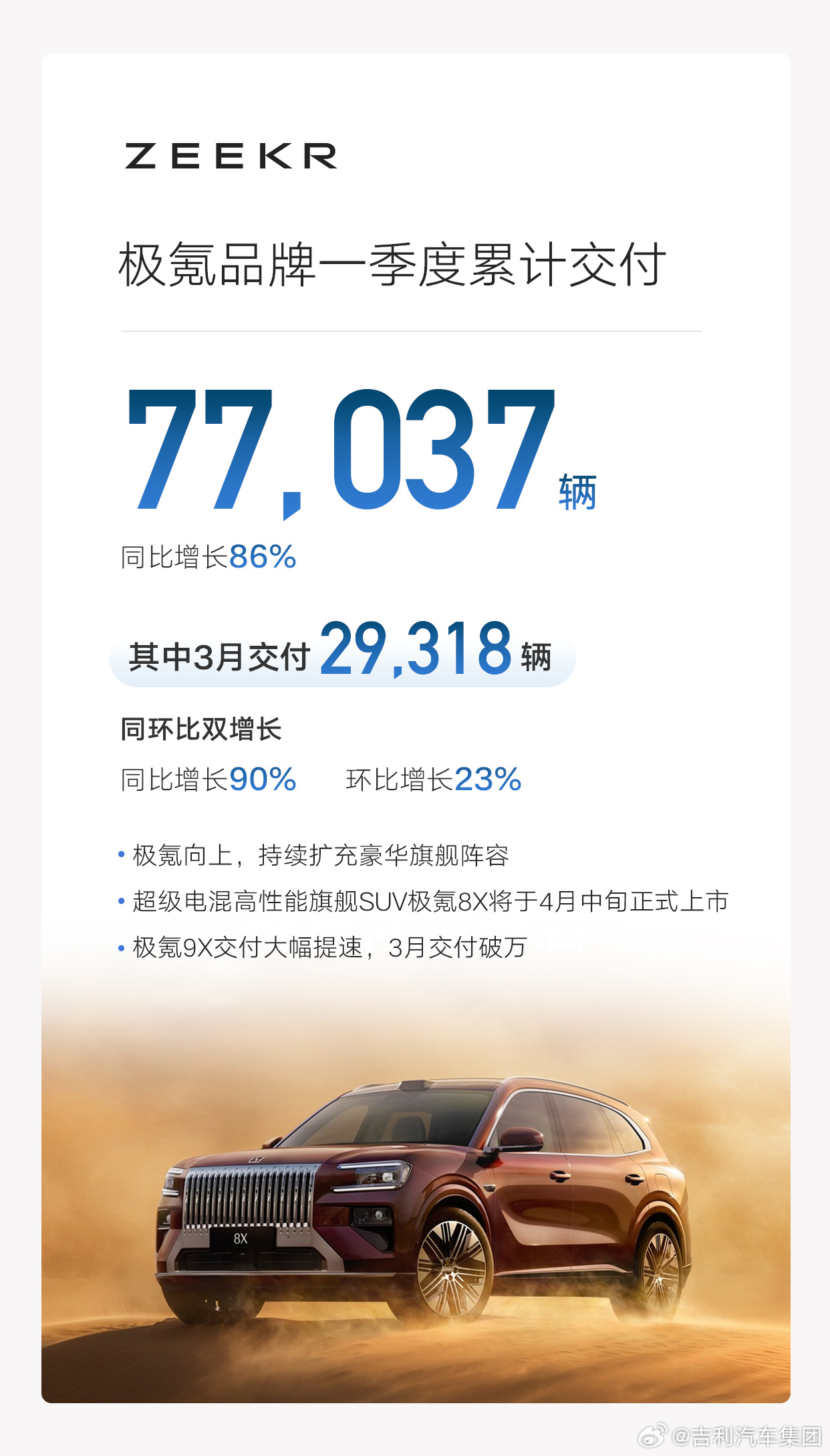 4、极氪品牌累计销量77037辆(3月销量29318辆)。