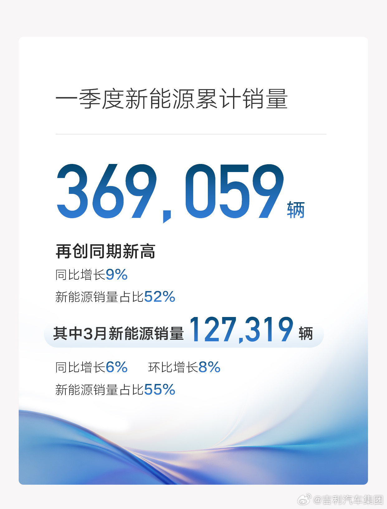 吉利汽车集团3月销量233031辆,环比增长13%;一季度累计销量709358辆,其中新能源累计销量369059辆。一季度各品牌销量如下: