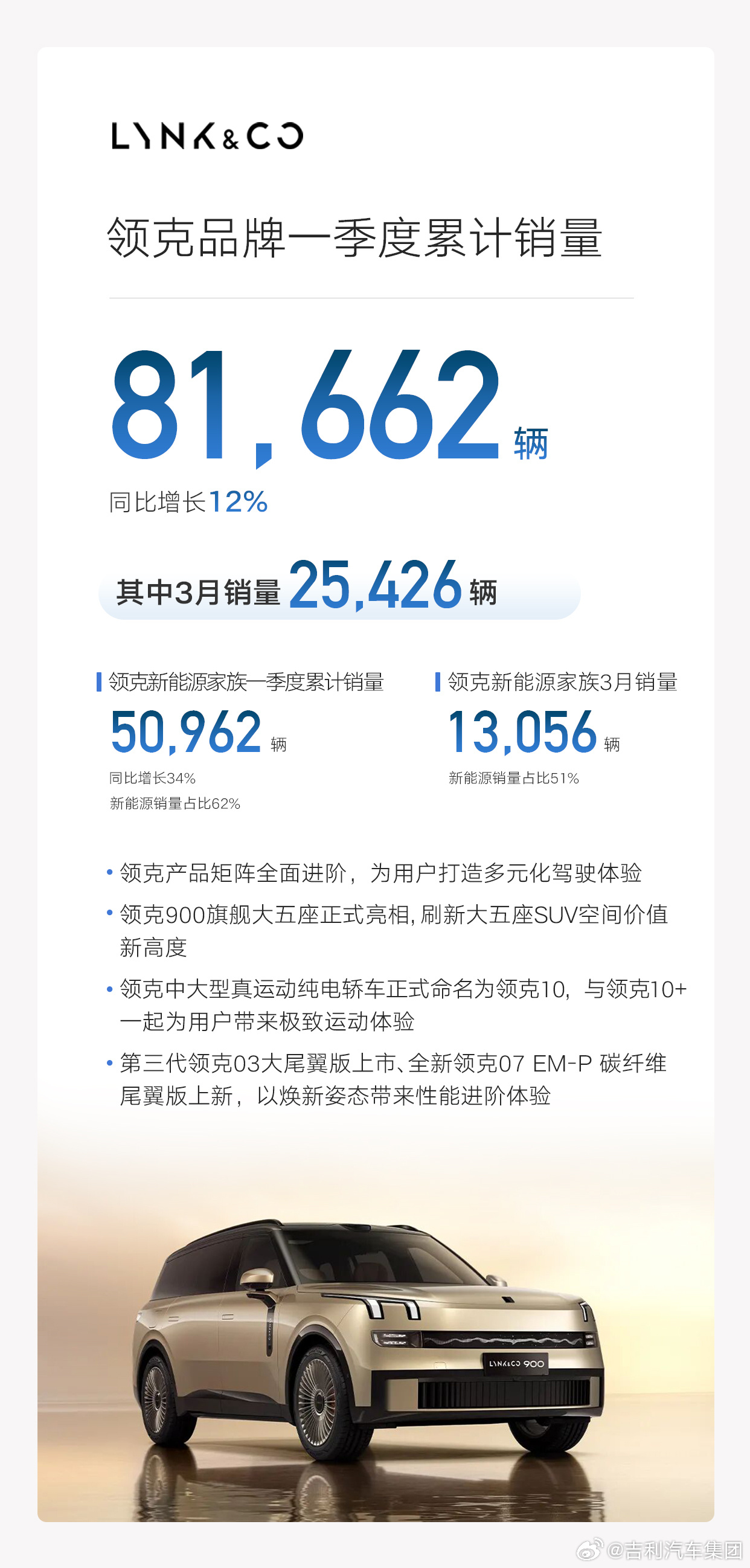 3、领克品牌累计销量81662辆(3月销量25426辆);