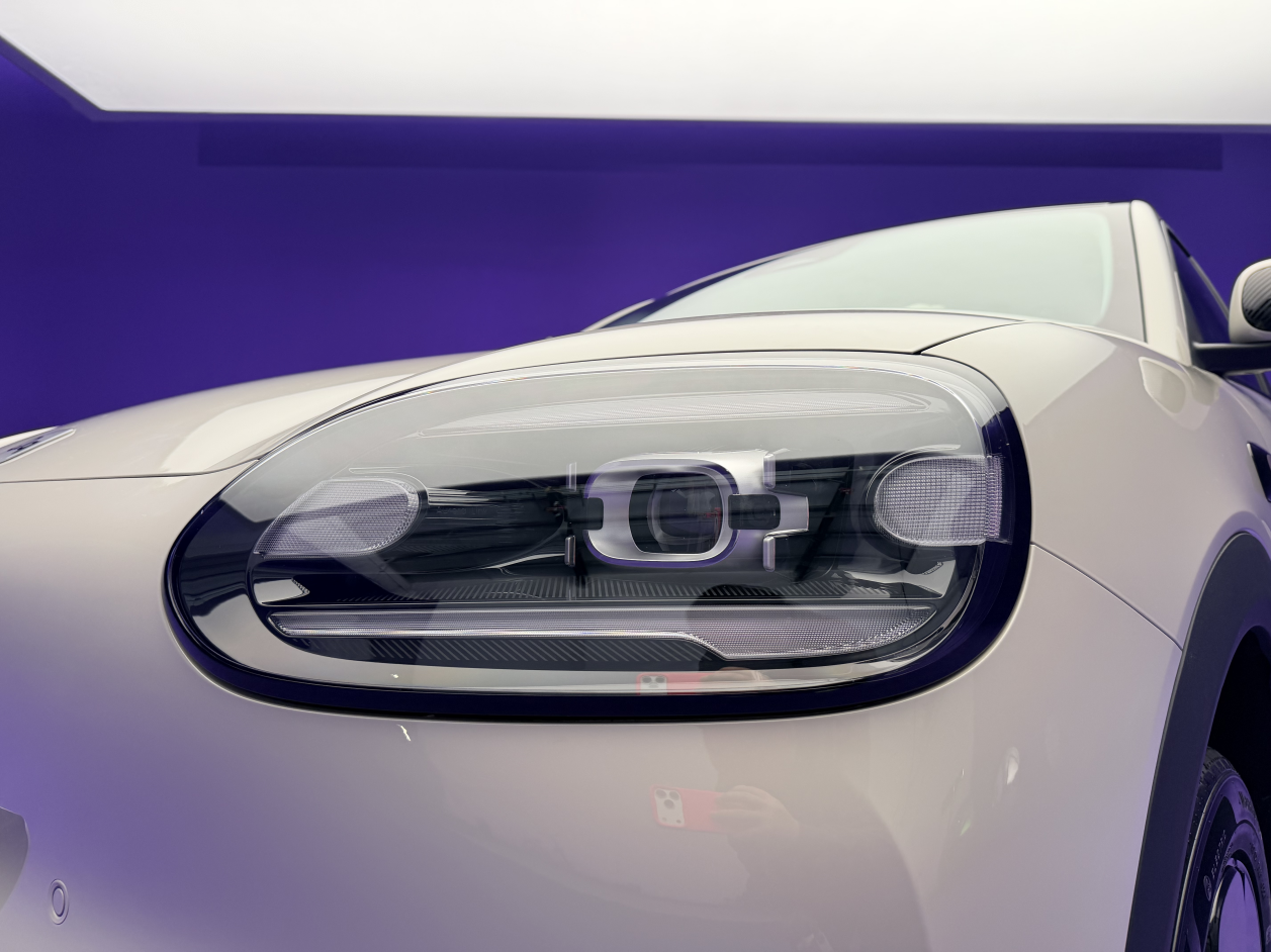 两侧Q型前大灯是设计亮点,内部藏有双条灵动光带,精致有余且萌感十足。前包围整体也采用了弧形的线条进行勾勒,同时两侧采用了斜纹的设计,让前脸看上去并不单调。