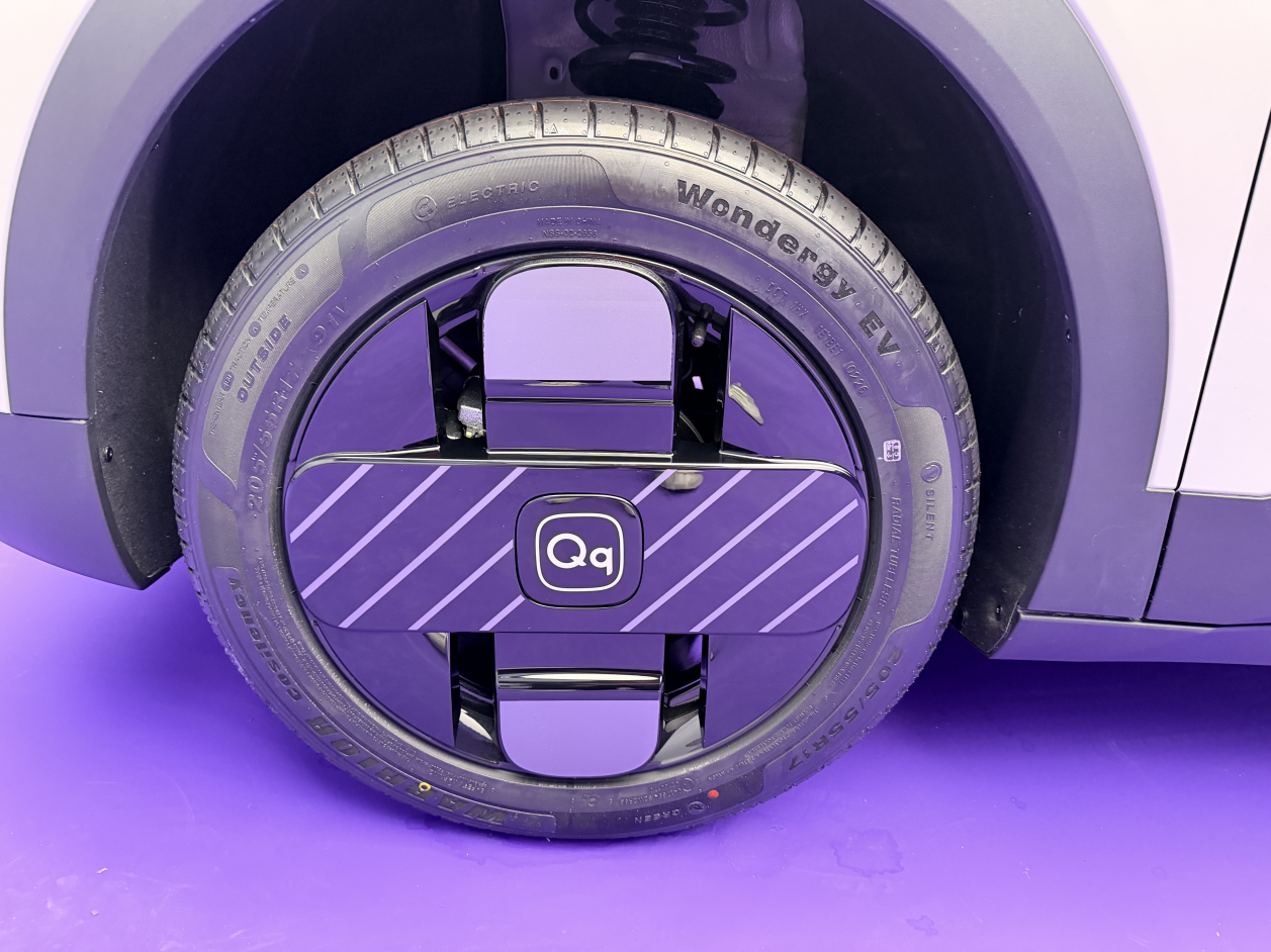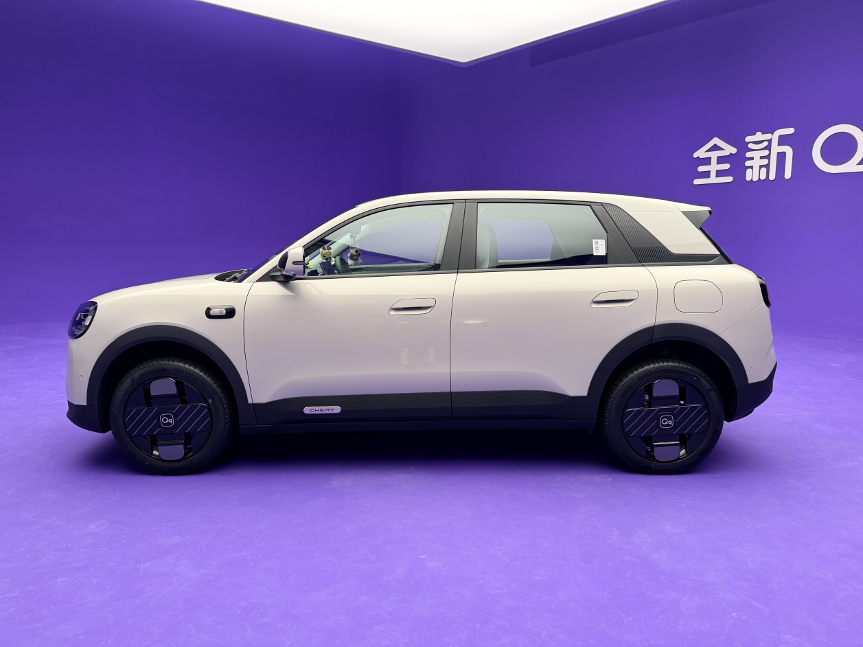 车身侧面延续了圆润流畅的线条,悬浮式车顶搭配半隐藏式门把手,既降低了风阻以提升续航,又增添了现代时尚气息,外后视镜和车门下方以及C柱都采用了类似碳纤维的纹理。前翼子板上的“Q”字标识,让车型身份一目了然。
