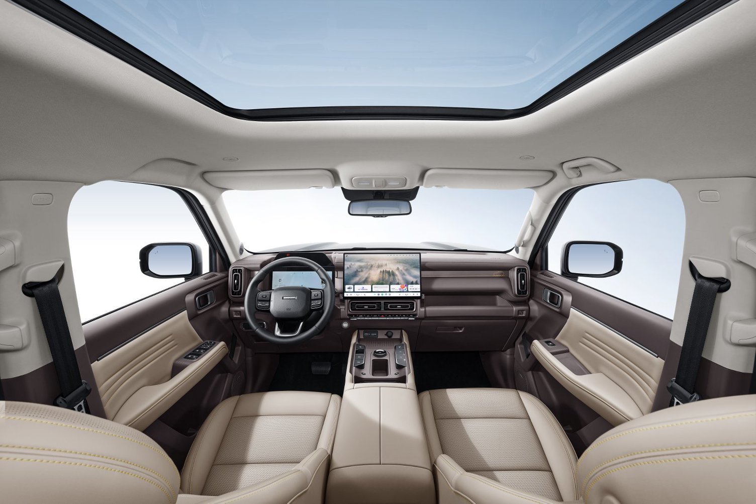 外观方面,新车前脸设计极具辨识度,棱眸式矩形大灯组气场十足,单侧灯组内置123颗LED灯珠,近光照射距离可达108米,远光照射距离延伸至189米,搭配自动大灯功能,兼顾照明效果与科技感。中央配备棱盾造型中网,采用精密丝网印刷工艺,经过七道工序加工而成,质感细腻,中央镶嵌品牌标识,进一步强化品牌辨识度。下方黑色进气格栅与银色护板相得益彰,既增强了前脸的层次感,又凸显了硬派越野属性。